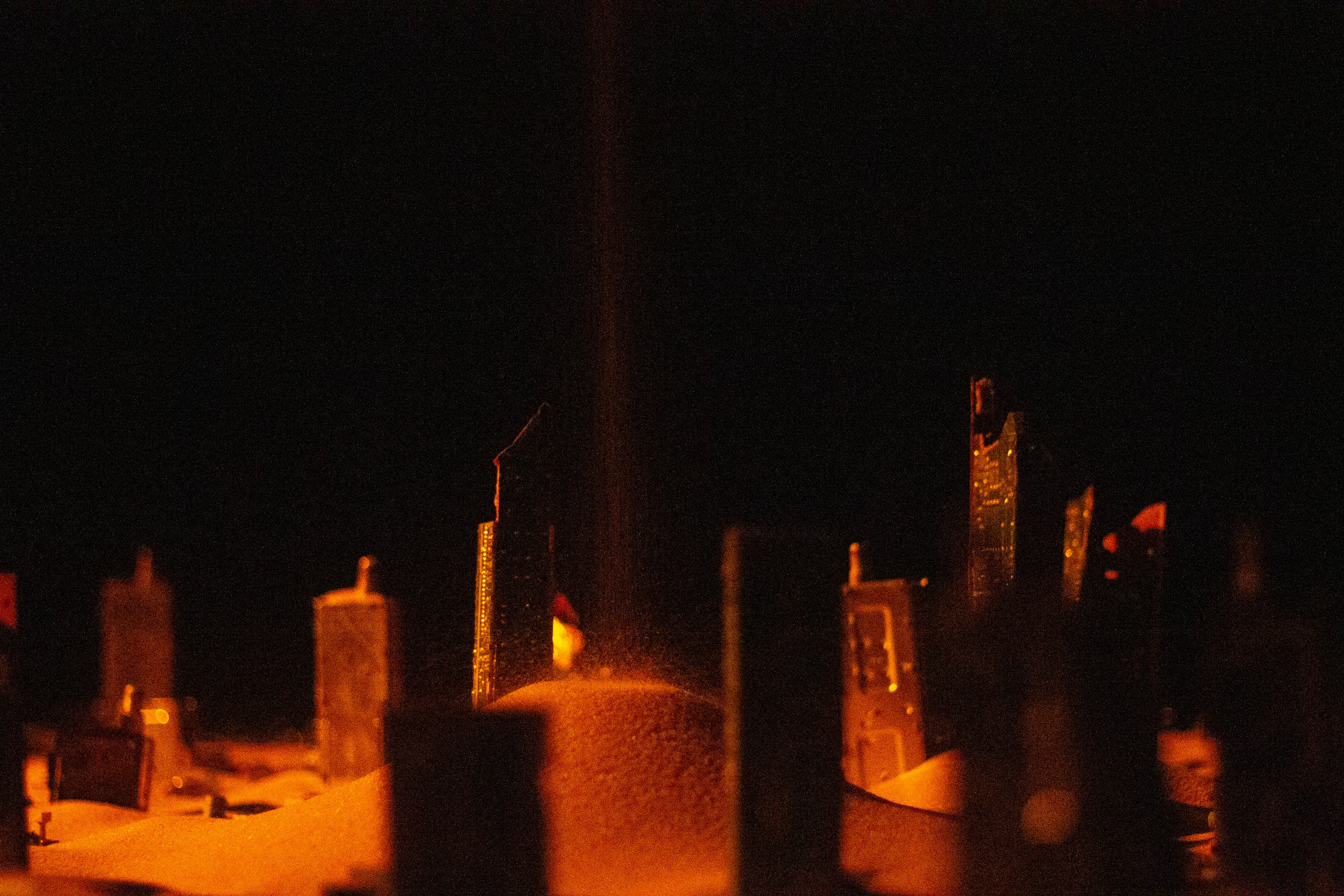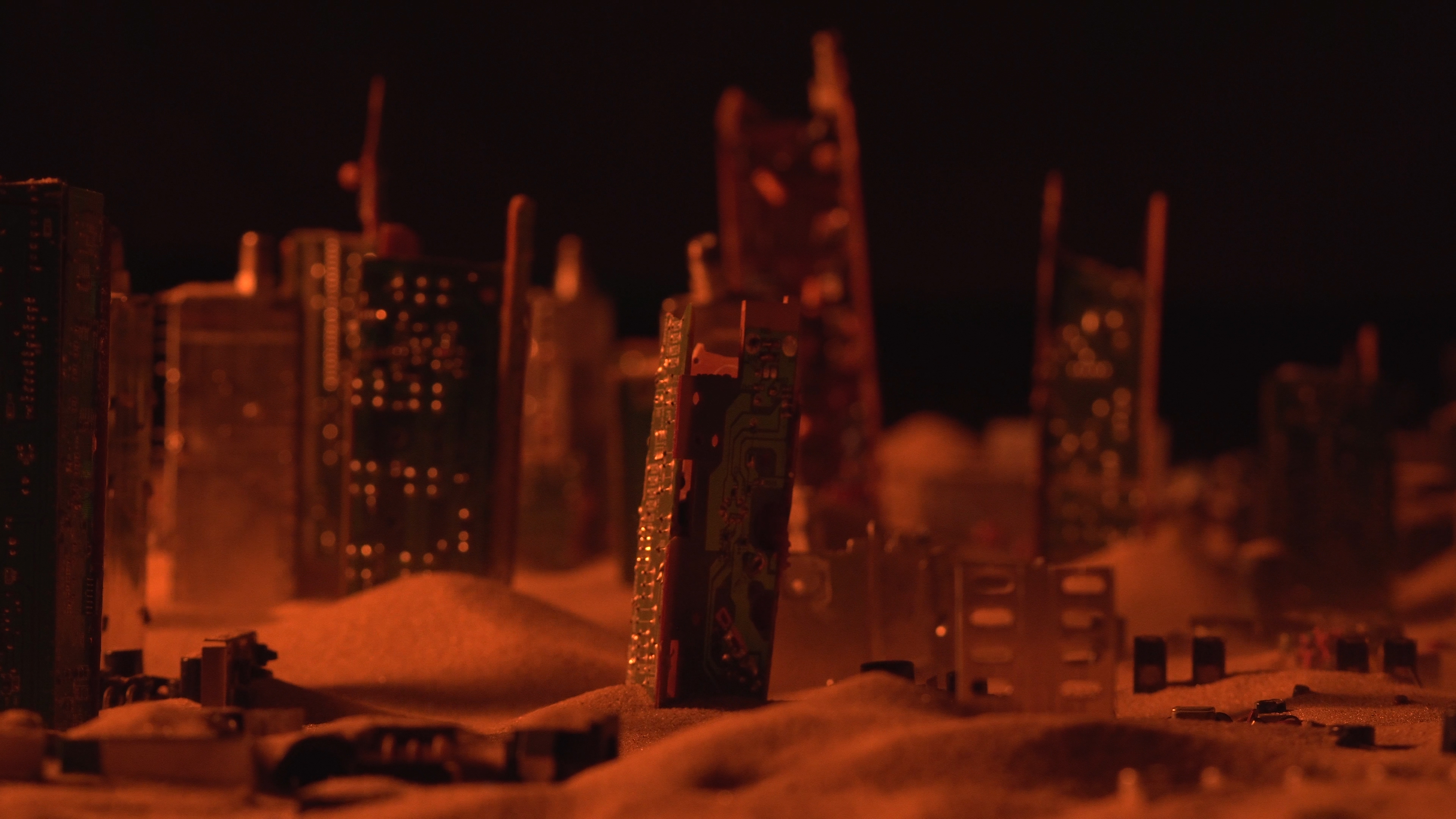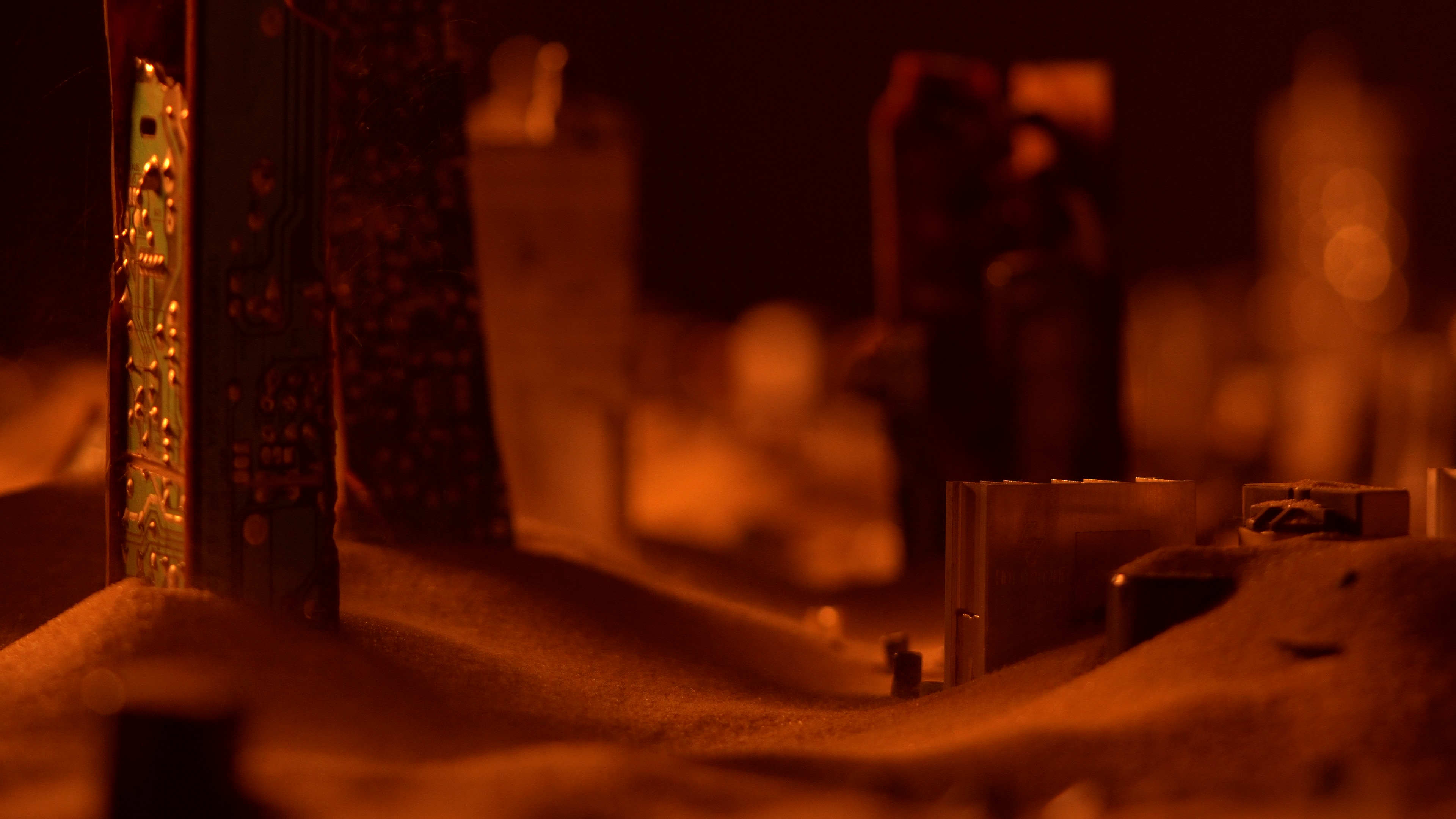 Una ciudad se muestra entre la arena, dejando ver retazos de una civilización fallida. La avanzada tecnología parece ser la razón del ocaso de esta sociedad, donde el territorio y los cuerpos se volvieron polvo.